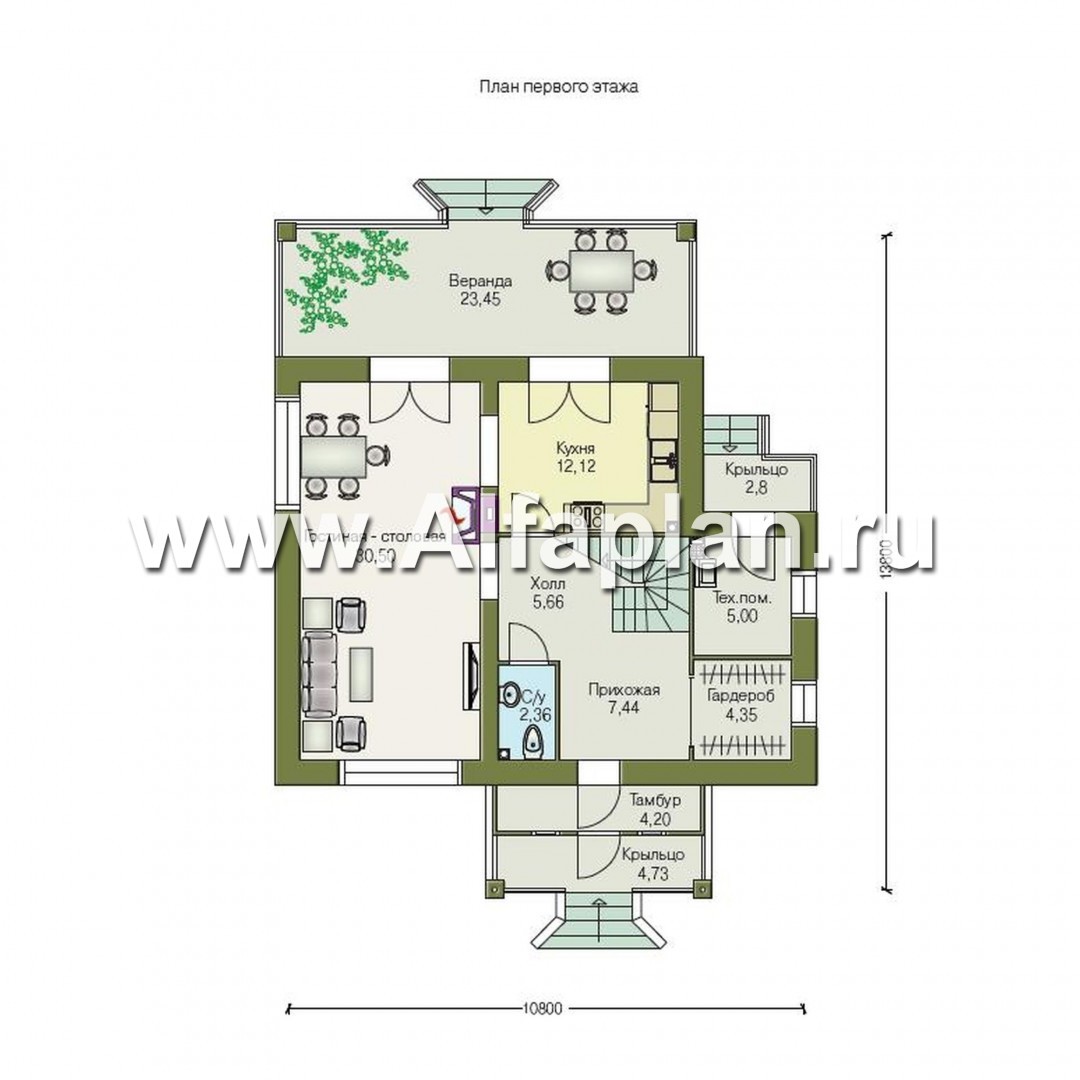 Поднявшись на небольшое крыльцо, через входную дверь мы попадаем в вытянутый тамбур площадью 4 квадратных метра. Затем, проследовал через входную дверь, мы оказываемся в большой прихожей, в которой расположена лестница на второй этаж. Здесь же справа находится сантехнический узел. Также на первом этаже располагается большая гостиная, столовая, кухня, техническое помещение и гардероб. Из кухни предусмотрен отдельный выход на открытую веранду, расположенную на улице.