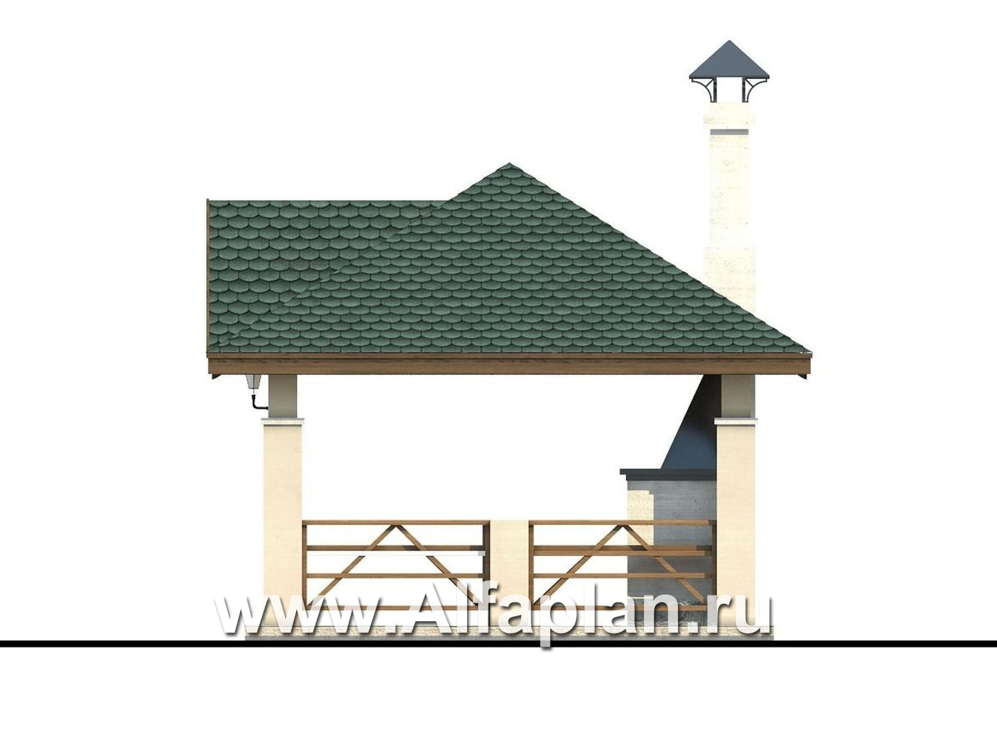 Беседка разделена на две равные по площади зоны — зона мангала и обеденная зона. С точки зрения пожарной безопасности и удобства все продумано до мелочей: мангал ограничен кирпичной кладкой, что исключает возможность самопроизвольного возгорания; в обеденной зоне легко разместится стол на 8 персон, что делает эту часть беседки весьма функциональной.
