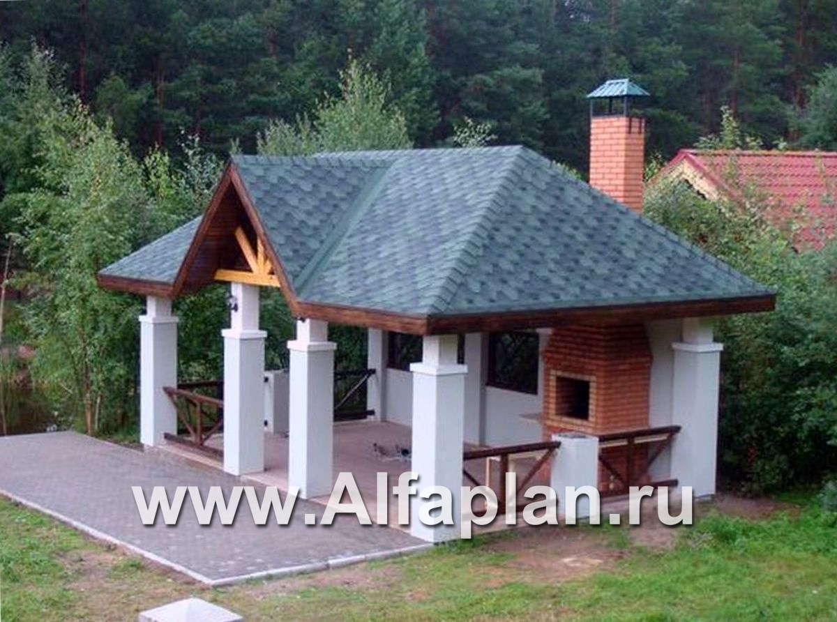 Оригинальная беседка-павильон площадью 30 м² приятно порадует вас оригинальным экстерьером и продуманной геометрической формой. Сама беседка состоит из 8 колонн, кирпичного мангала, бетонной загородки с деревянным заборчиком и крыши. В качестве кровли используется битумная черепица — универсальное и хорошо зарекомендовавшее себя инженерное решение. Утеплителем выступает минеральная вата, а оконные профили выполнены из поливинилхлорида. Монолитная железобетонная плита, которая выступает в качестве фундамента беседки, гарантирует долгий срок эксплуатации конструкции на протяжении многих десятилетий.
