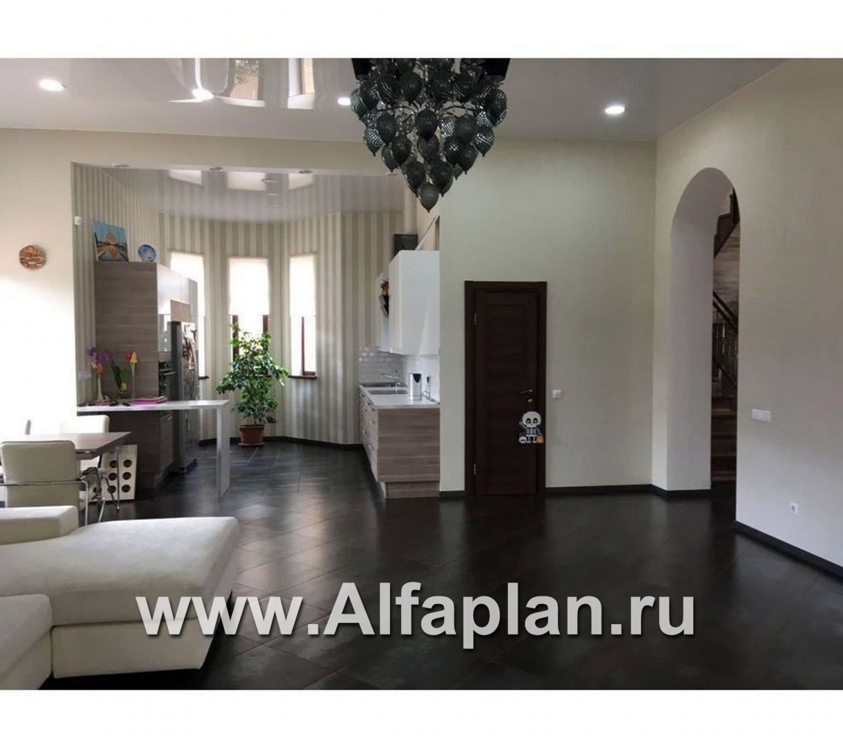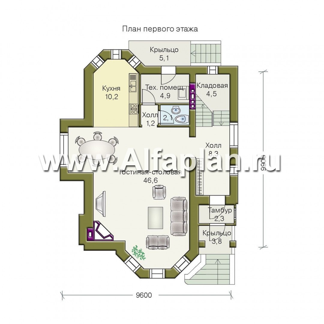 Гостиная совмещена с 10-метровой кухней с эркерным выступом. На первом этаже есть санузел, кладовая и техническое помещение с выходом на дополнительное крыльцо.