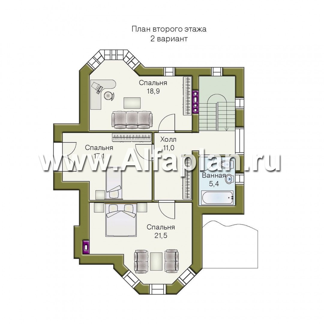 Поднимаясь по лестнице, попадаем на второй уровень коттеджа. Пространство этажа занимает 9-метровый холл, 3 спальни площадью 22 м², 17 м², 12 м² и две ванных комнаты площадью 4 м² и 5 м². 12-метровая спальня хорошо освещена благодаря широким эркерным окнам. Комнату можно расширить до 19 м² за счёт ванной.