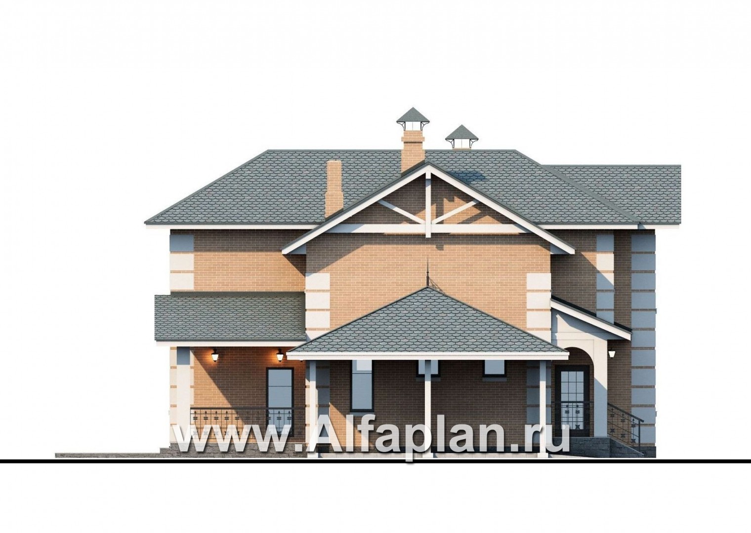 При этом представленный здесь кирпичный (газобетонный) дом является примером современной трактовки классики. Создать подобное ощущение помог принцип асимметрии, использованный при компоновке архитектурных элементов. Кроме того, в оформлении фасадов использованы не свойственные классике приемы: к примеру, два из трех фронтонов закрыты декоративными внешними сваями.