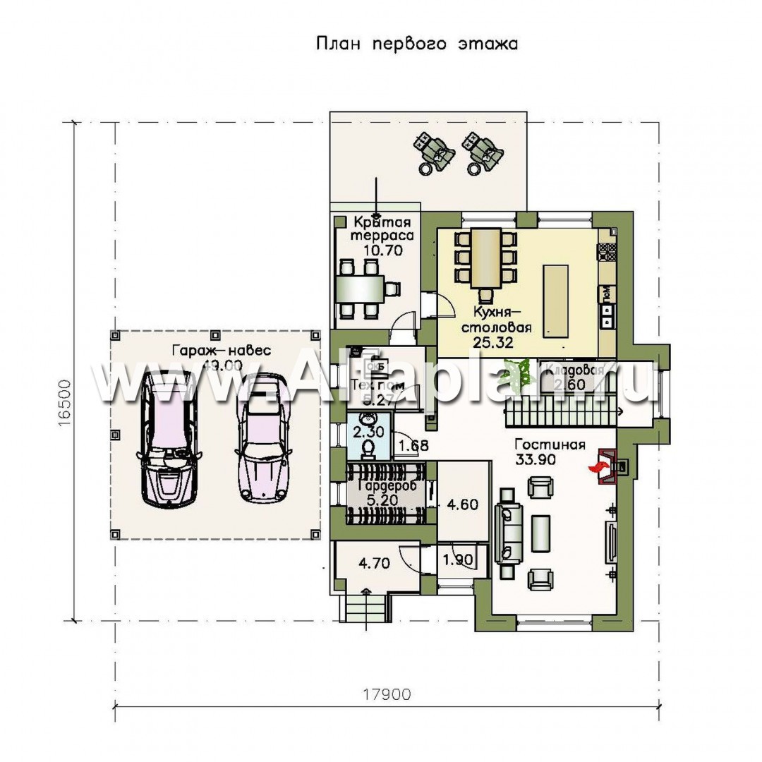 «Потемкин» - проект двухэтажного дома из газоблоков, планировка с лестницей в гостиной и мастер спальня, навес на 2 авто - технические характеристики