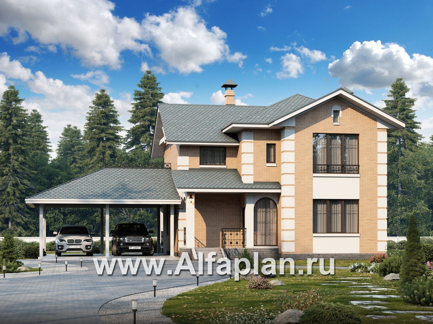 188B-S «Потемкин» - проект двухэтажного дома из газоблоков, планировка с лестницей в гостиной и мастер спальня, навес на 2 авто