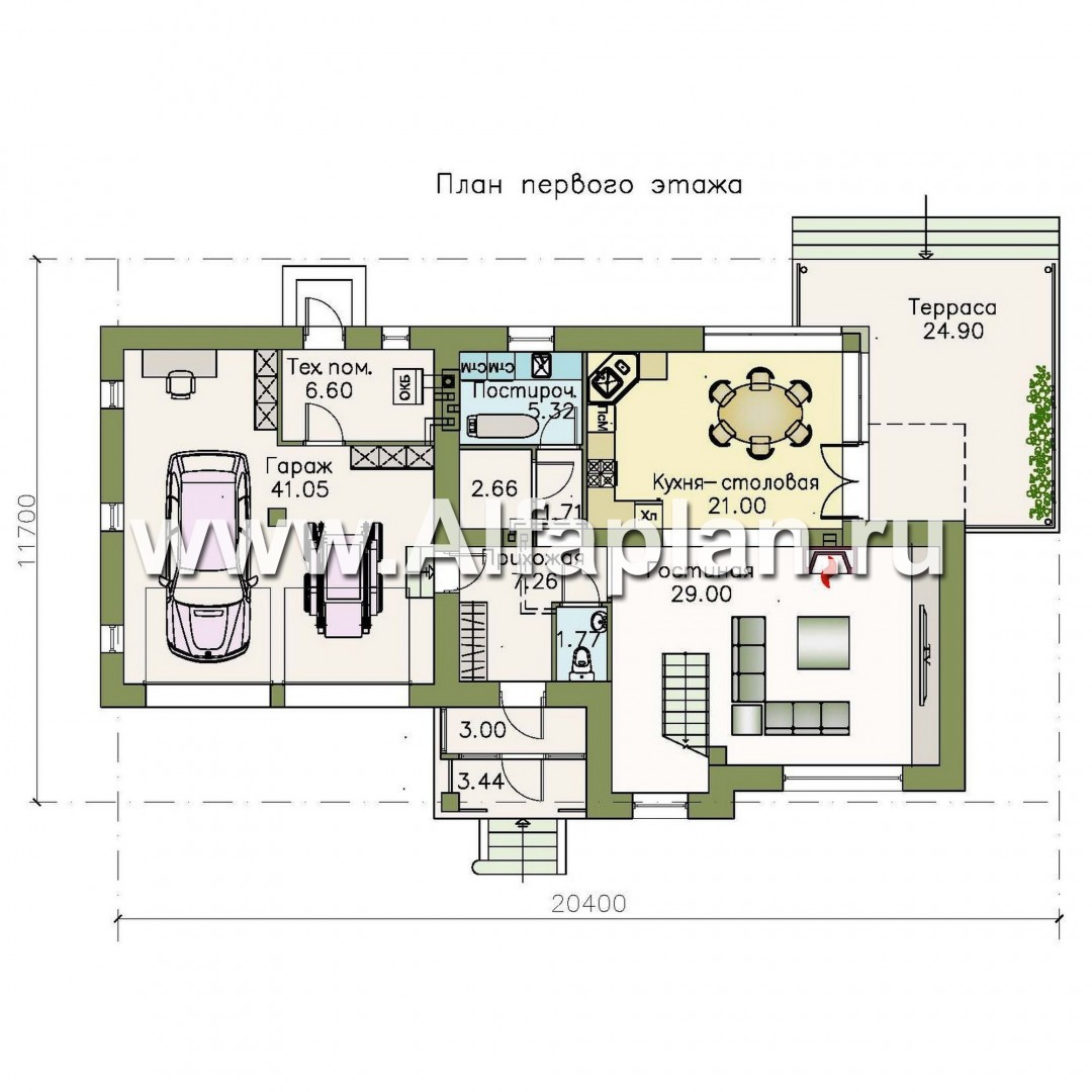 На первом этаже есть санузел, постирочная, техническое помещение и гараж площадью 41 м².
