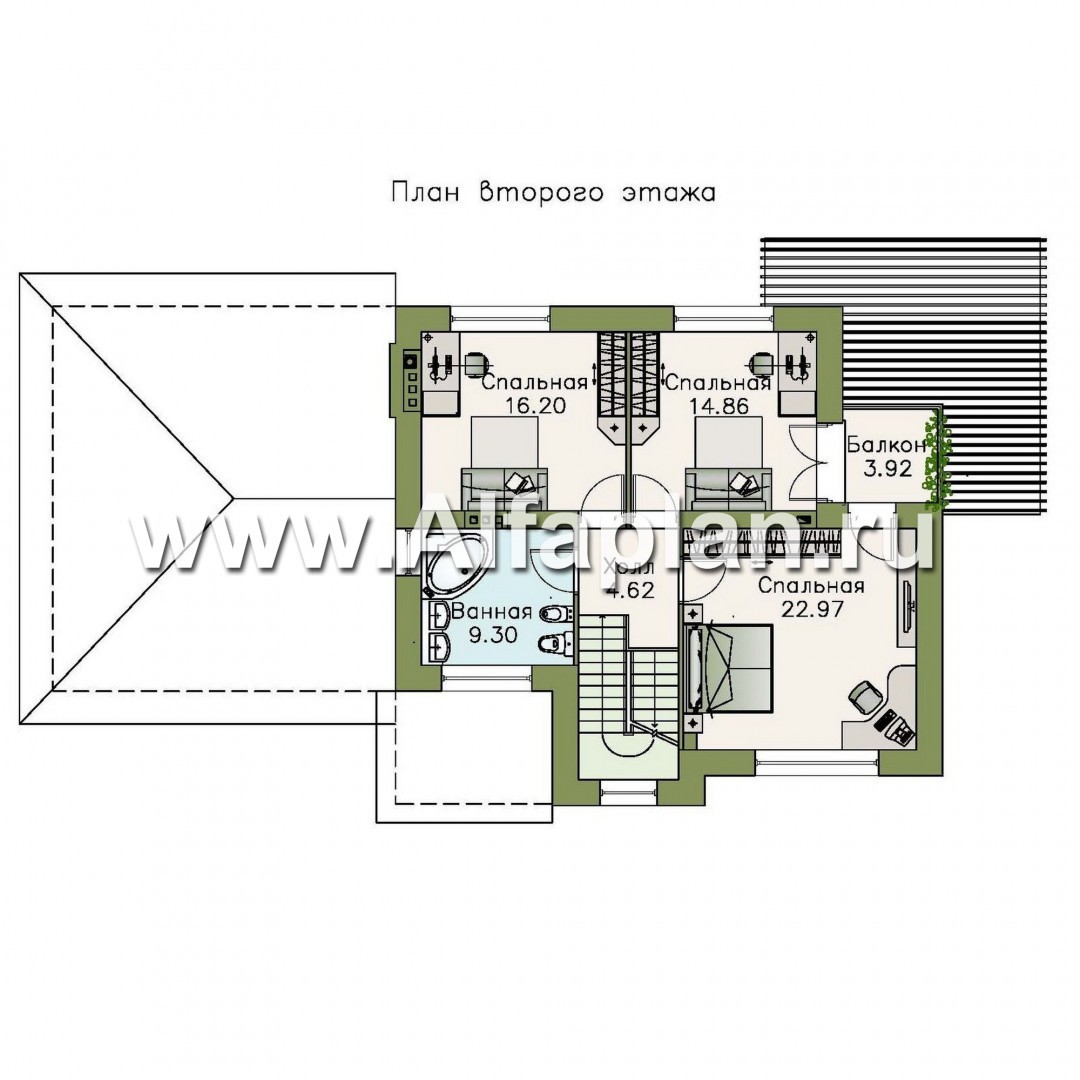 Поднимаемся по лестнице на второй этаж и попадаем в 5-метровый холл. Весь этаж — комфортная зона отдыха с 3 спальнями и 9-метровой ванной комнатой. Из двух соседствующих комнат 23 и 15 м² есть выход на компактный квадратный балкон. С балкона открывается вид на террасу.