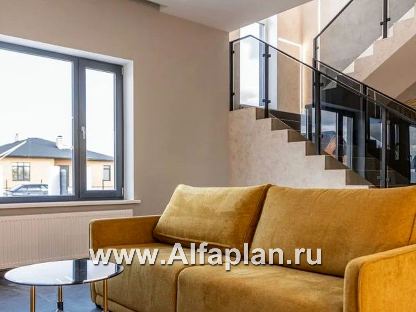 Внимание привлекают широкие окна со скругленными углами и изящный декоративный элемент на крыше дома. Отличительная деталь оформления фасада — арочное окно с белоснежной облицовкой, вытянутое на 2 этажа.