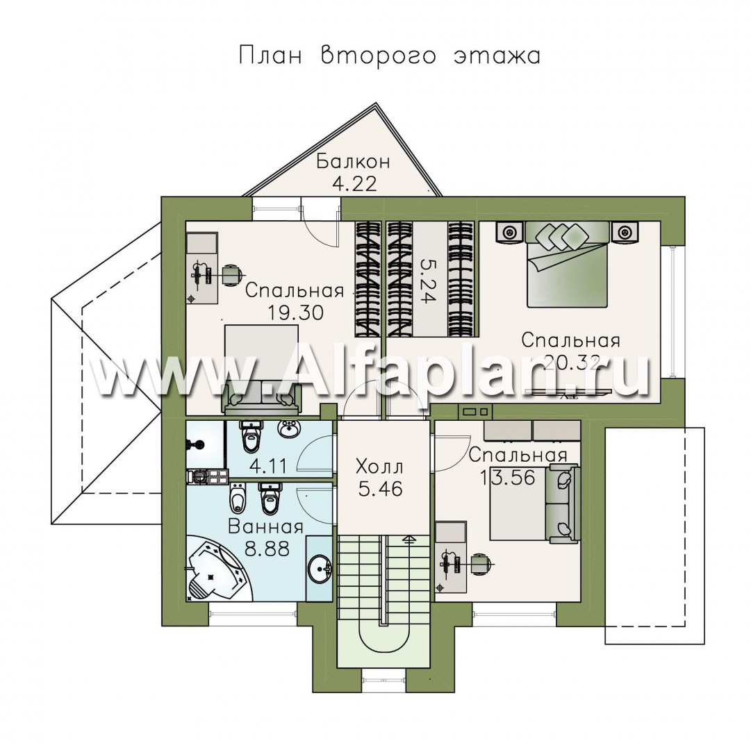 Широкий лестничный пролет приводит в холл второго этажа, который полностью отдан под приватные зоны. Здесь расположены три спальни разной площади, две из которых подразумевают наличие гардеробных помещений. На втором этаже проектом предусмотрено два санузла. Помещение большей площади при желании легко оборудуется угловой ванной, биде, унитазом и раковиной. Меньший санузел предназначен для монтажа душевой кабины.