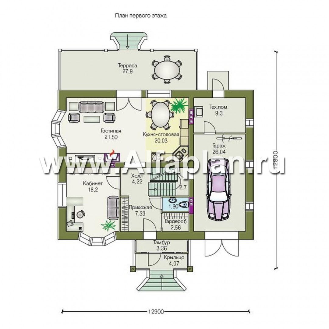 Проект двухэтажного загородного дома с гаражом и террасой привлекает внимание удобной, рациональной планировкой и спокойной, по-европейски сдержанной архитектурой.  Дом представляет собой блокировку жилого объема и гаража с мансардой. Что же касается дизайна экстерьера коттеджа в общем, то здесь есть свои, по-особенному привлекательные мотивы. Если говорить в целом, то в экстерьере нет лишних деталей: все создает атмосферу уюта, спокойствия и предельной компактности. Окна первого этажа, выполненные эркерами, удачно сочетаются с крышей благодаря своим кровельным навесам. Также хорошо украшает дом и придает ему дополнительный уют небольшое открытое крыльцо, выполненное из дерева и искусственного мрамора. Фундамент коттеджа – монолитная ж/б плита. Наружные стены дома по проекту предусматривают альтернативу материалов: можно использовать газобетонные блоки и кирпич. Так что этот дом вполне можно отнести к категории «проекты домов из газобетона и кирпича».