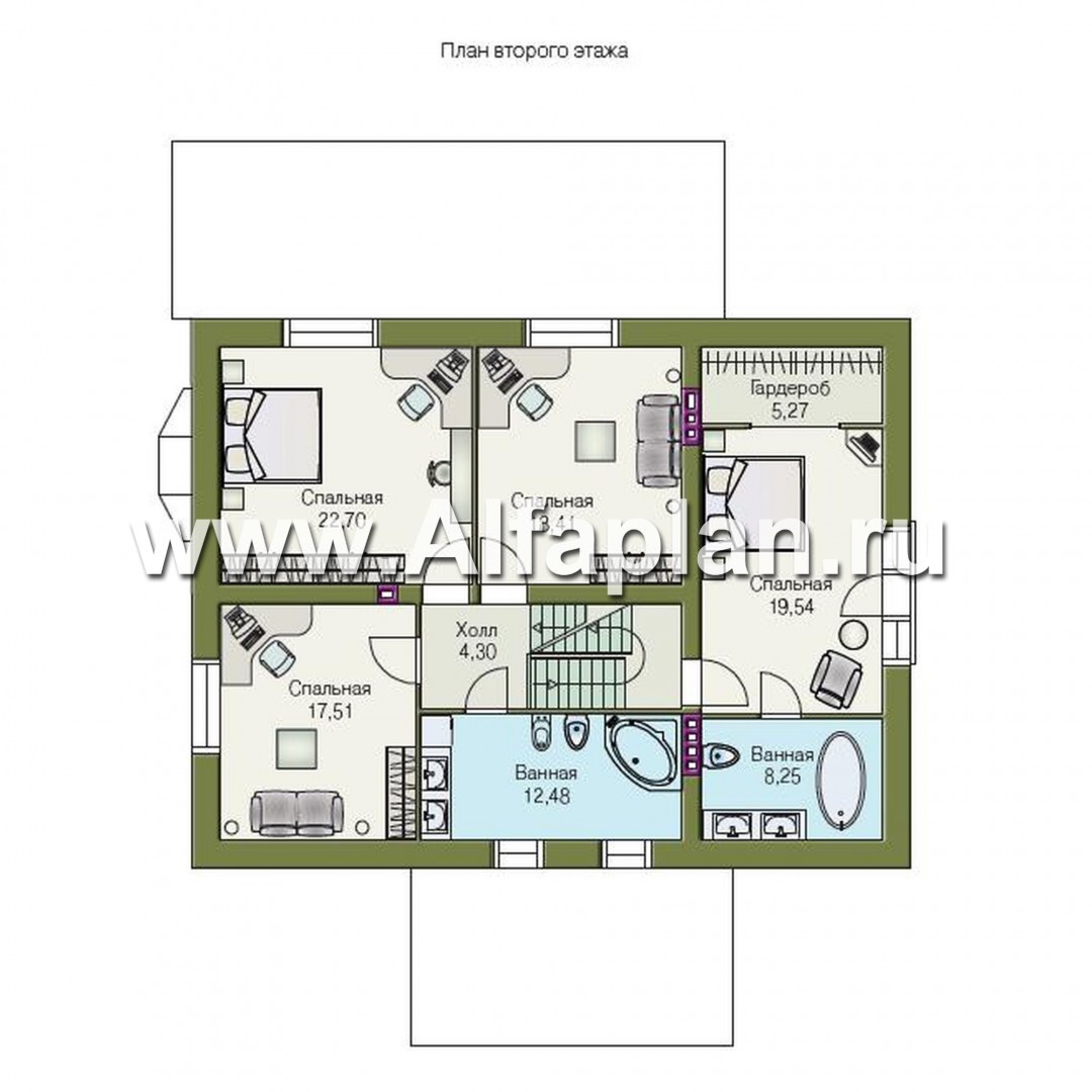 Предваряет вход в дом изящное крылечко и остекленный тамбур. На первом этаже  в этом загородном доме находятся гостиная, кухня-столовая и кабинет. Кабинет может использоваться как спальня или гостевая. Жилая комната на первом этаже – безусловный плюс предложенной в проекте планировки. Из гостиной распашные двери ведут на террасу. Удобно решена связь с гаражом, в него можно попасть из холла, спустившись на несколько ступенек. Второй этаж имеет два уровня. На нижнем, над гаражом находится  спальня со своей ванной и гардеробной, на верхнем – еще три спальни и ванная комната. Такой состав помещений обеспечит комфортное проживание достаточно большой семье. При этом рациональный подход к объемно-планировочному и конструктивному решению позволят занять этому готовому проекту одно из лидирующих мест в нашей коллекции.