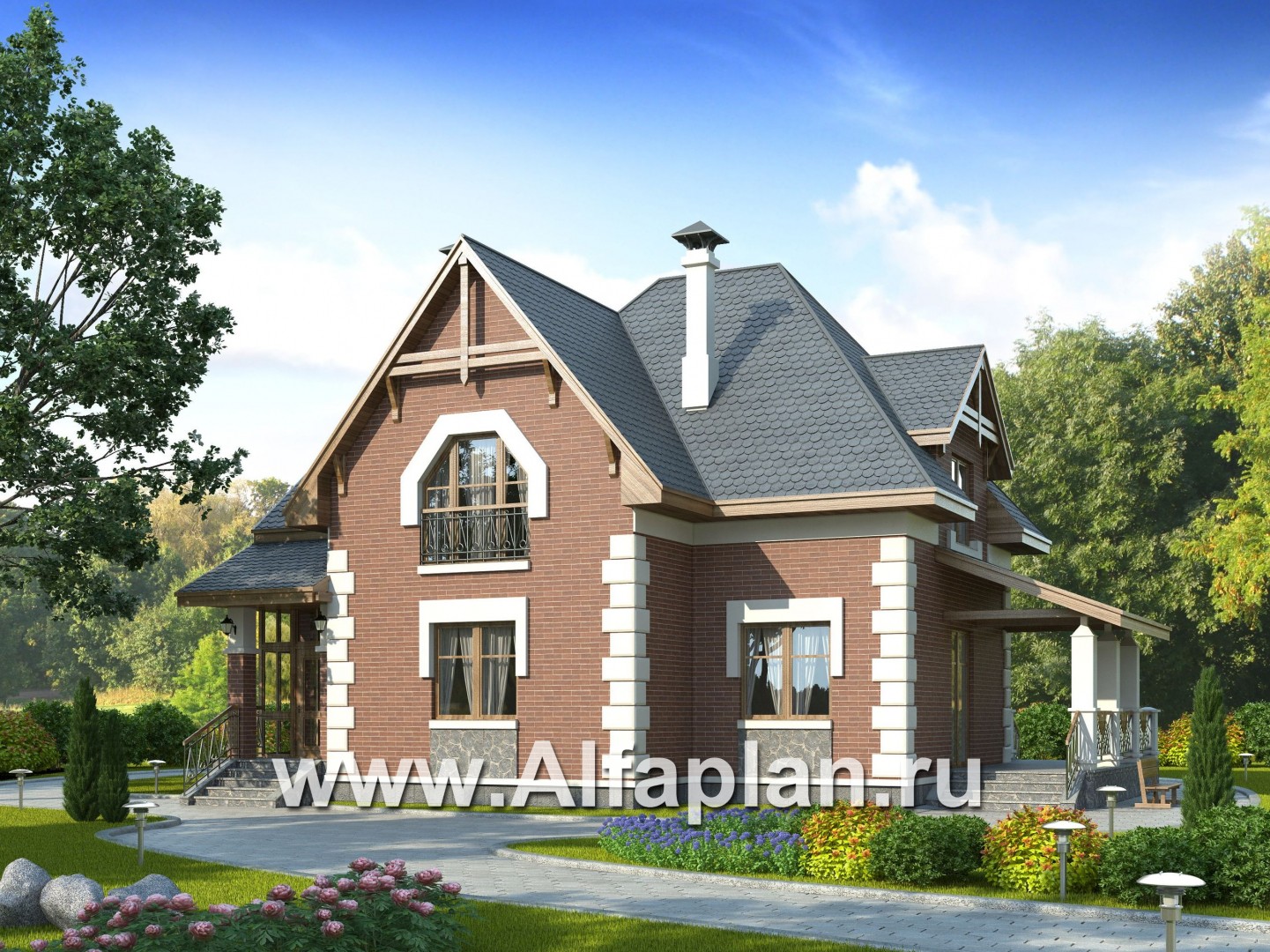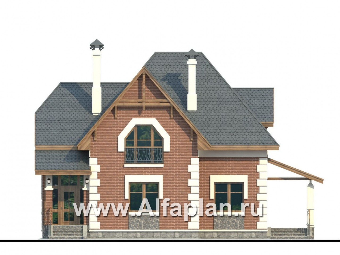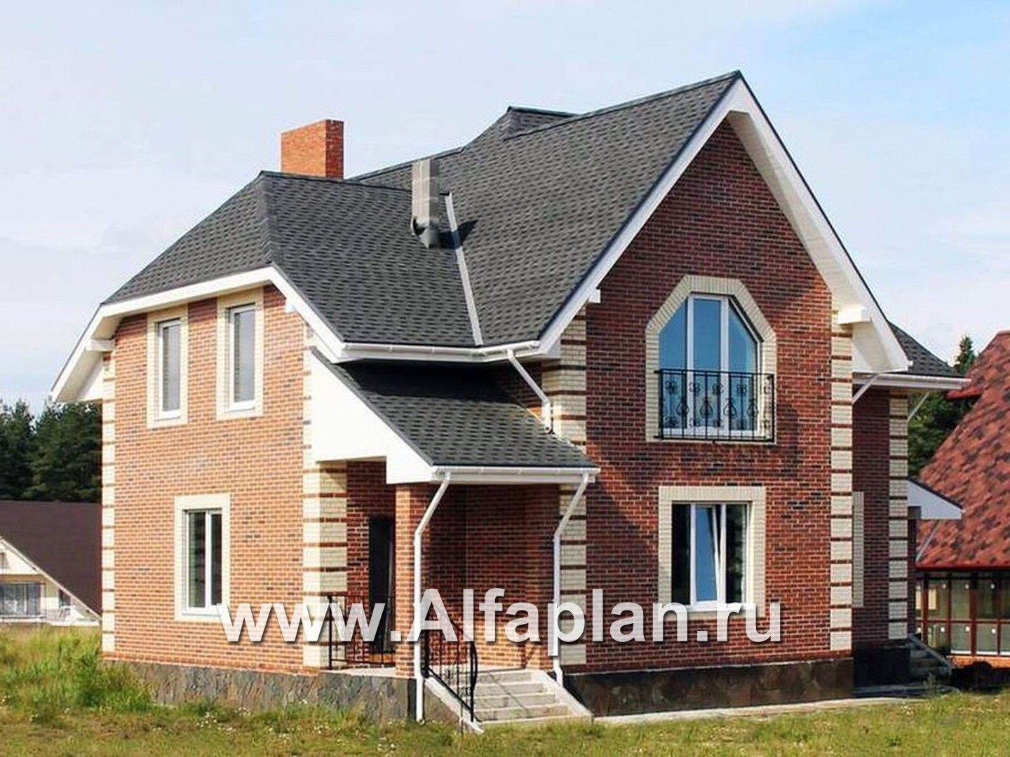 В этом небольшом загородном доме с комфортом разместится семья из 4-5 человек.  Проектом предусмотрены два этажа. Высота первого – 3.0 м, второй этаж полумансардный, высотой 2.85 м, уклон потолка начинается на высоте 1.9 м от пола. Небольшой чердак не эксплуатируется, подвал в доме отсутствует.  Экстерьер имеет очень удачное сочетание. Архитектурные фрагменты деталей дома радуют взгляд.  Красная кирпичная и белая блочная наружная отделка стен выгодно контрастируют с серым цветом мраморной отделки цоколя и ступенек крыльца. Также бросается в глаза белое обрамление окон и фасадный французский балкон, которые придают дополнительную чистоту и изящество всему экстерьеру. Фундамент дома образован монолитной железобетонной плитой. Наружные стены предусматривают альтернативу в отношении материала: могут быть использованы газобетонные блоки или кирпич. В этом отношении коттедж вхож в категорию «кирпичные и газобетонные дома».