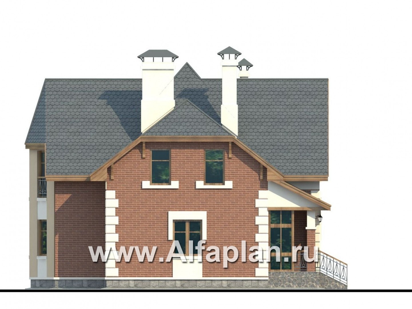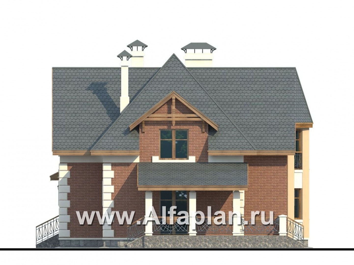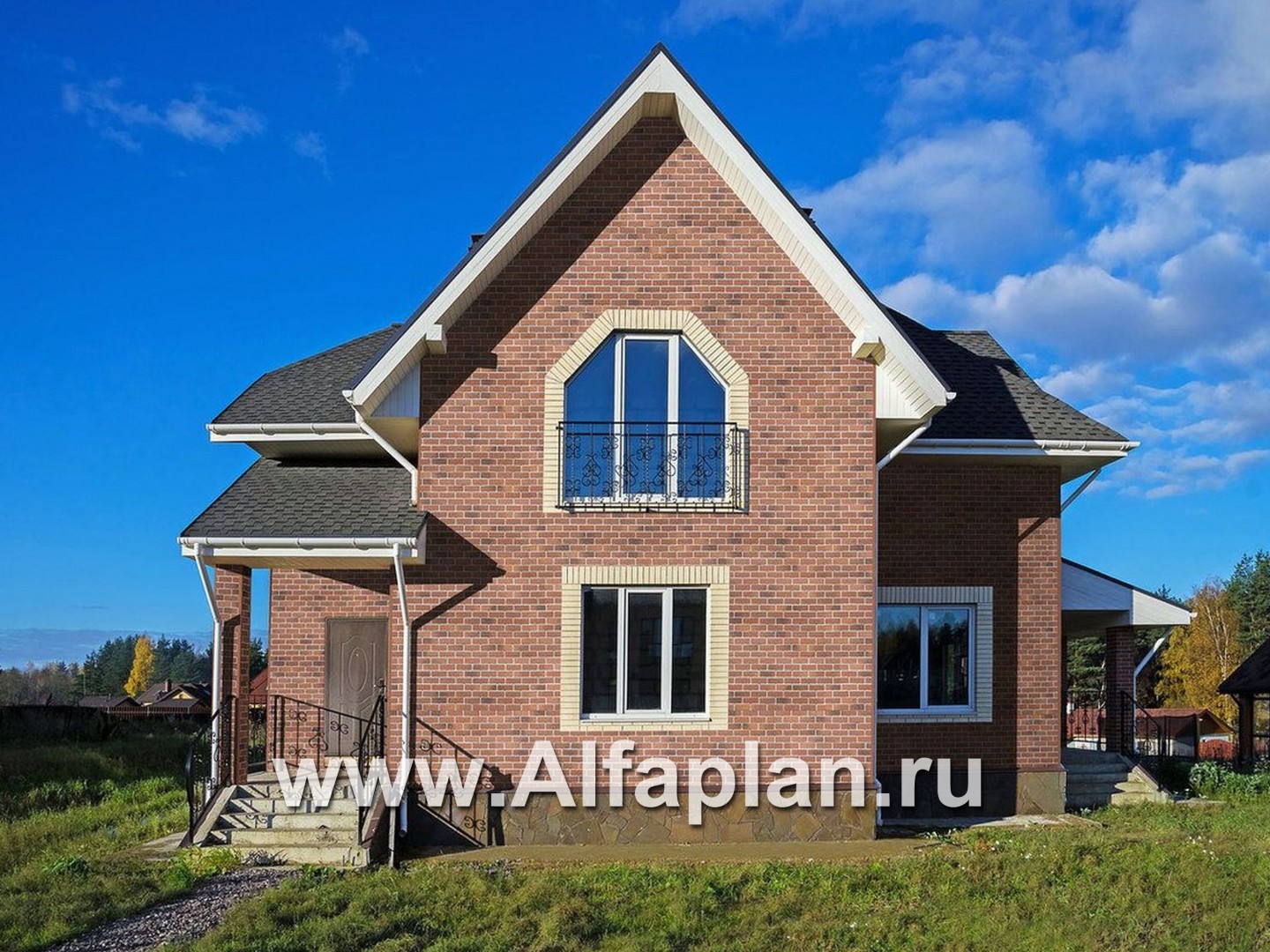 В этом небольшом загородном доме с комфортом разместится семья из 4-5 человек.  Проектом предусмотрены два этажа. Высота первого – 3.0 м, второй этаж полумансардный, высотой 2.85 м, уклон потолка начинается на высоте 1.9 м от пола. Небольшой чердак не эксплуатируется, подвал в доме отсутствует.  Экстерьер имеет очень удачное сочетание. Архитектурные фрагменты деталей дома радуют взгляд.  Красная кирпичная и белая блочная наружная отделка стен выгодно контрастируют с серым цветом мраморной отделки цоколя и ступенек крыльца. Также бросается в глаза белое обрамление окон и фасадный французский балкон, которые придают дополнительную чистоту и изящество всему экстерьеру. Фундамент дома образован монолитной железобетонной плитой. Наружные стены предусматривают альтернативу в отношении материала: могут быть использованы газобетонные блоки или кирпич. В этом отношении коттедж вхож в категорию «кирпичные и газобетонные дома».