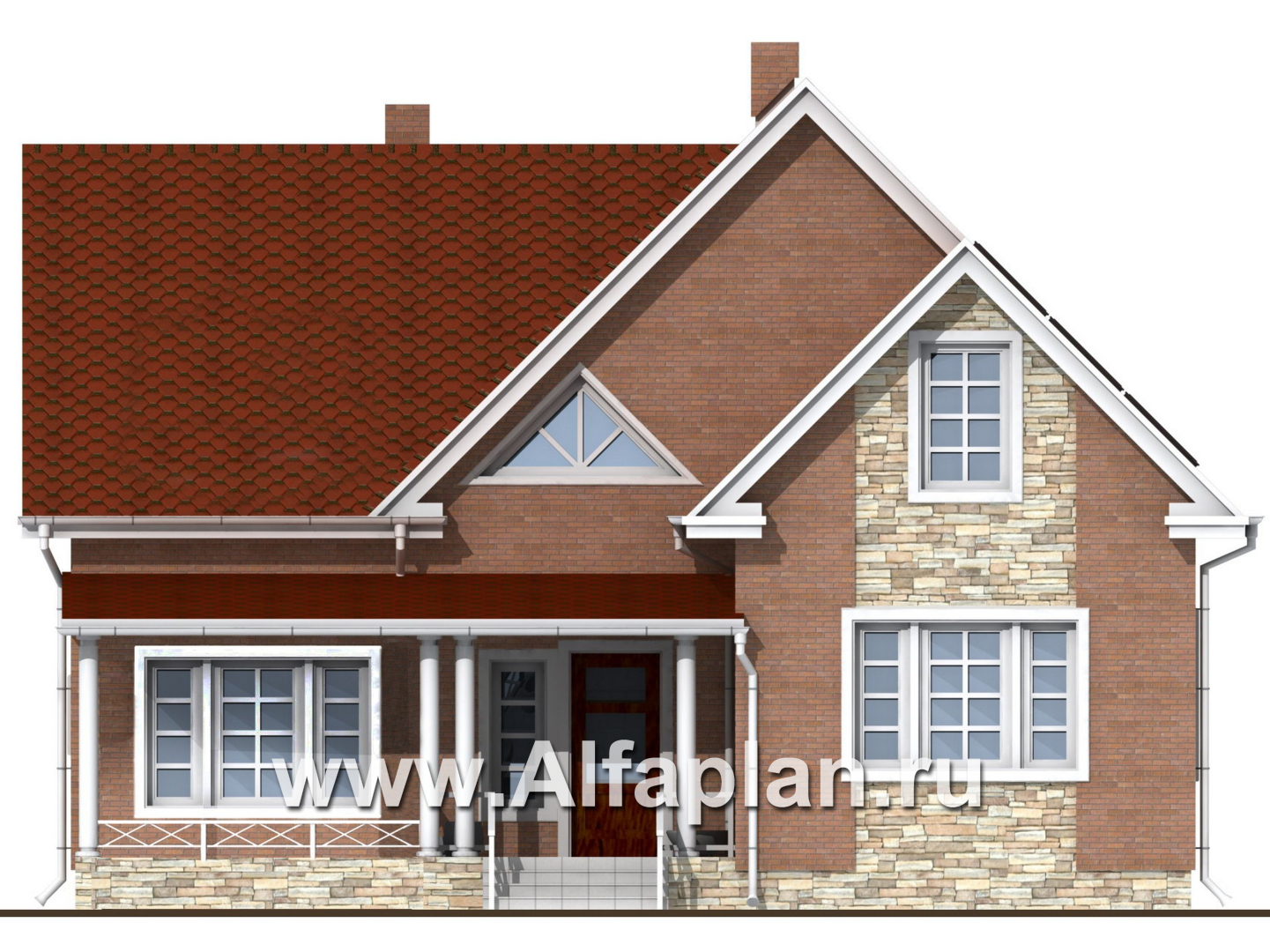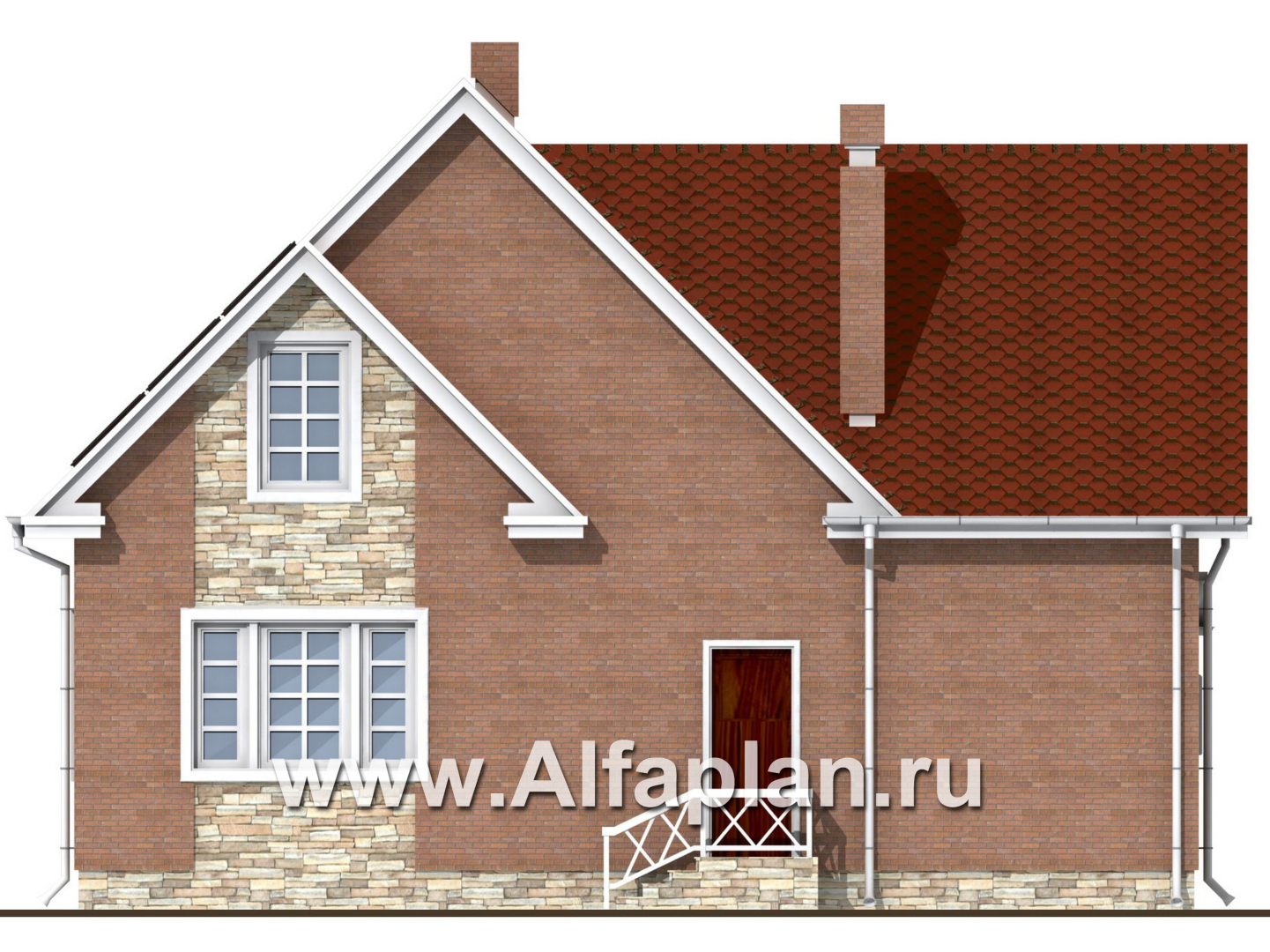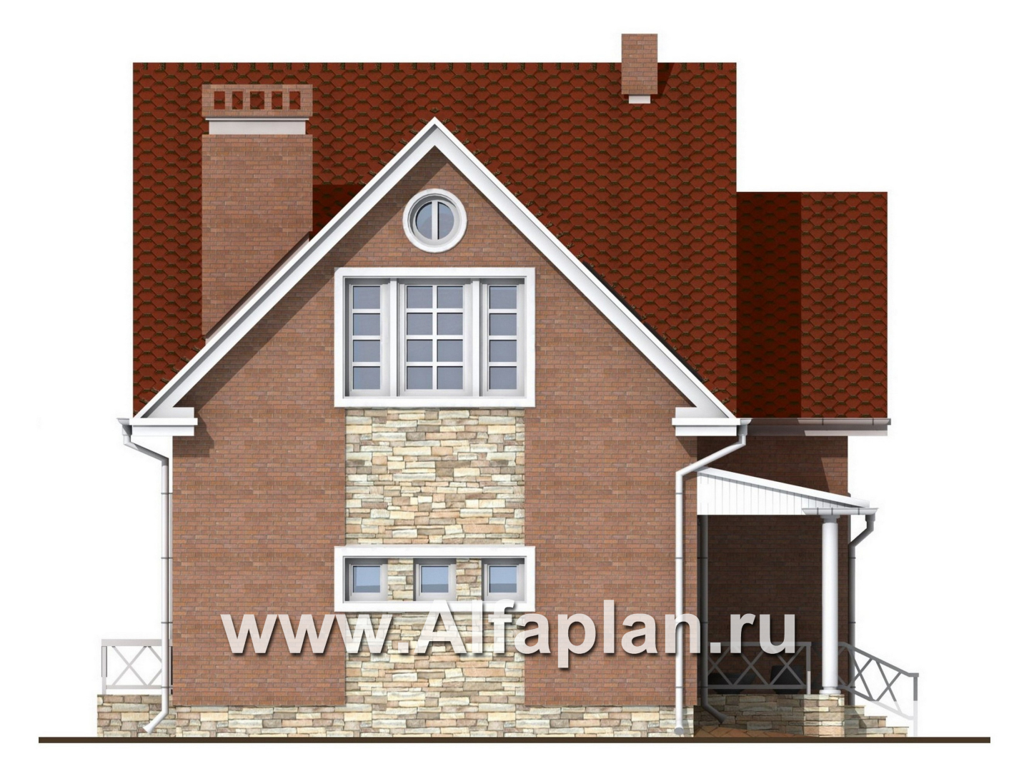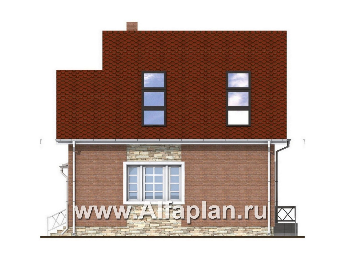 Функциональный проект коттеджа из кирпича позволит насладиться домашним комфортом в полной мере. Фундамент оформлен облицовочным камнем, что выглядит очень стильно и оригинально. Наружная отделка стен предполагает использование лицевого кирпича. Он смотрится богато, укладывается в спонтанный узор. Также имеются вставки из декоративной штукатурки, которая придает зданию особый шик.