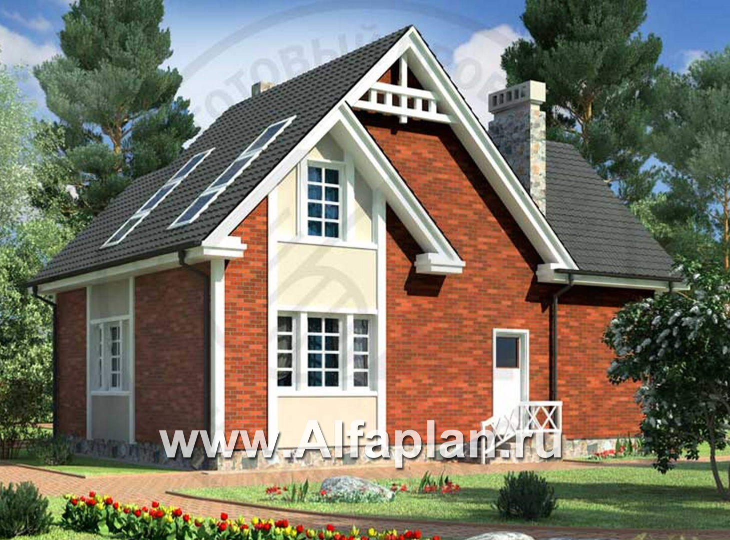 Интересная структура крыши, стильное оформление дымохода, потолочные окна, позволяющие любоваться красотой небосвода – все это делает дом очень красивым и уютным.