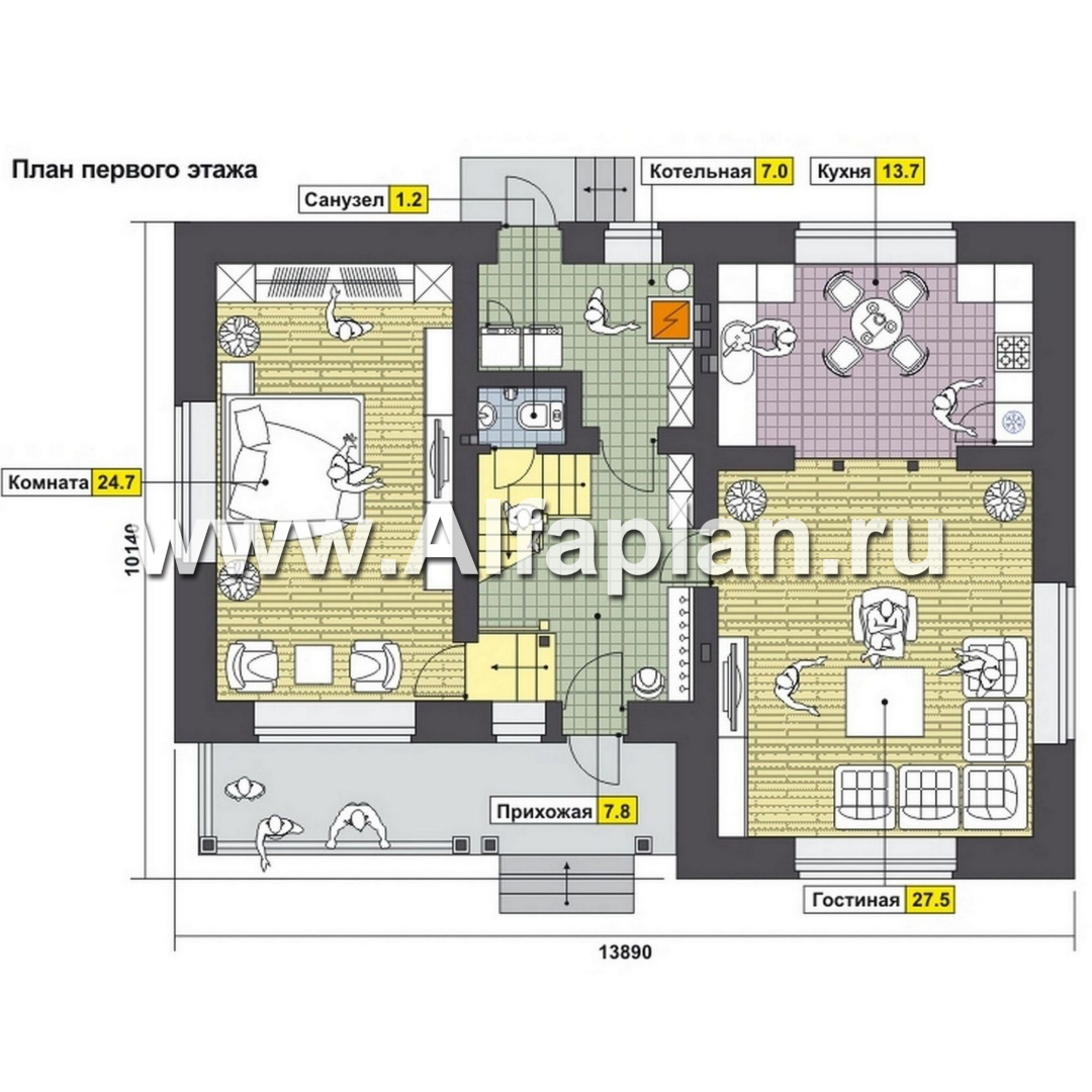 Проекты домов подобных этому предполагают обустройство первого этажа под зону общего пользования. Здесь располагается просторная гостиная (почти 28 кв. м.), кухня, комната для отдыха, небольших размеров санузел (предусматривает наличие только туалета и раковины), прихожая и котельная. Возле центрального входа имеется уютная терраса. С задней стороны здания обустроен запасной вход, который приведет вас в котельную, а оттуда – в прихожую.