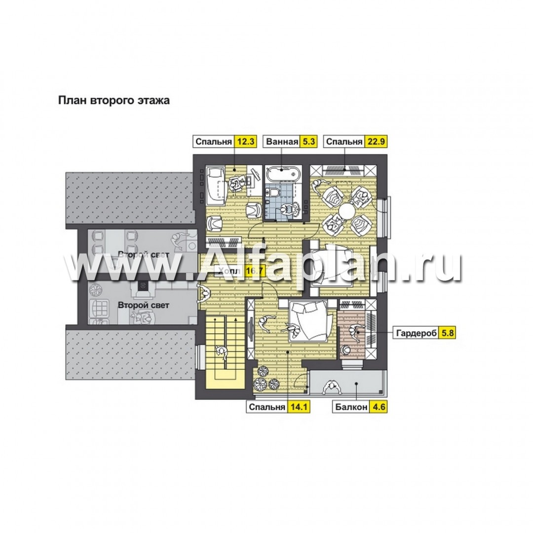 Проект дома с мансардой, план 2 спальни на 1 эт и второй свет гостиной, мастер спальня на 2 эт, с террасой и с балконом, в стиле хай-тек