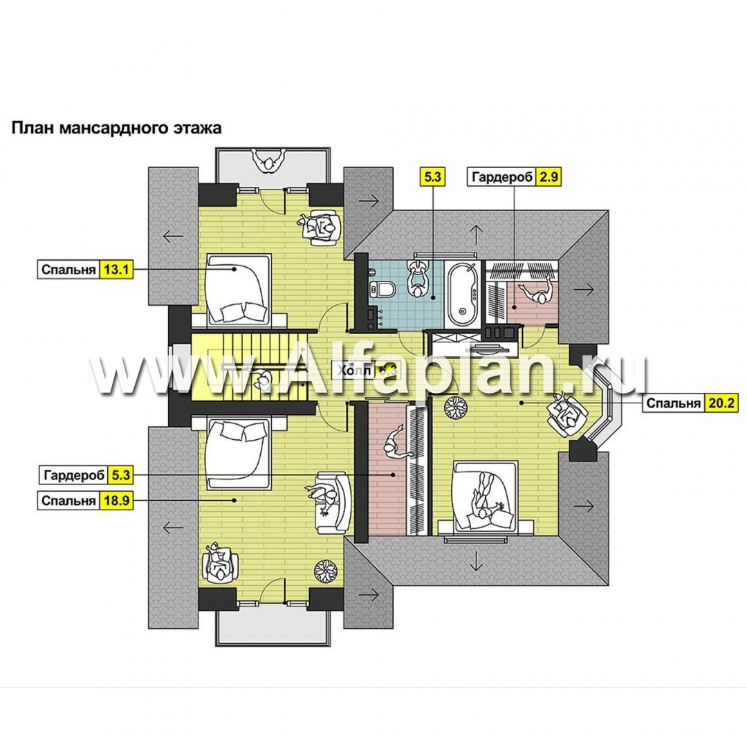 Проект коттеджа с мансардой, планировка с кабинетом и эркером, дачный дом - технические характеристики