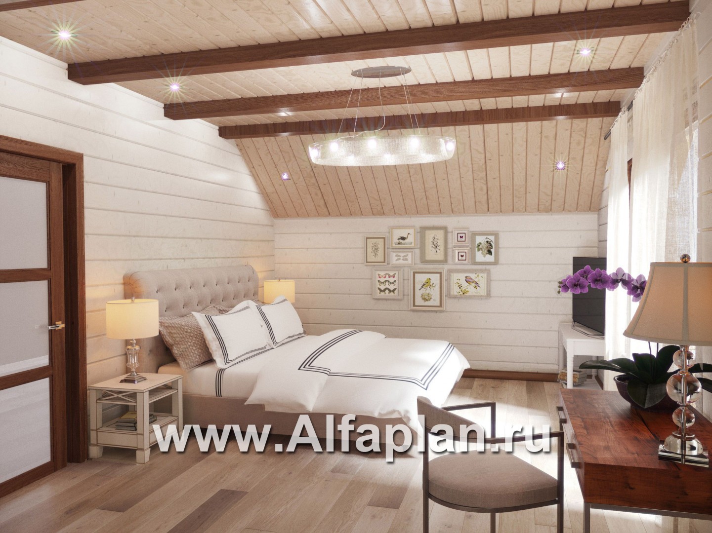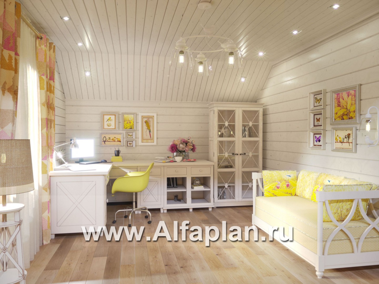 Проект дома с мансардой, из бруса, планировка с террасой и кабинетом на 1 эт, с эркером