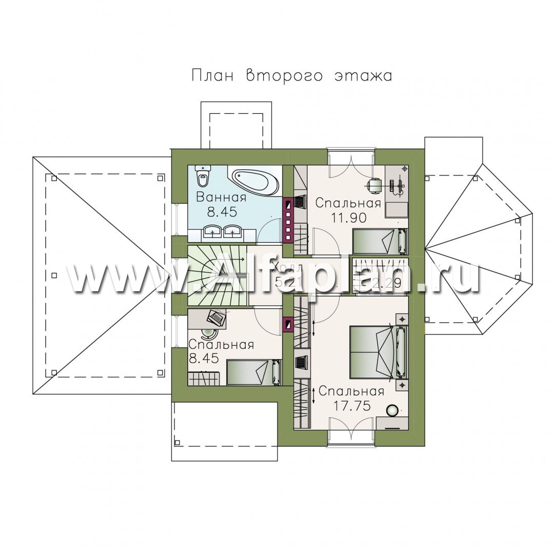 Второй этаж, по традиции, является зоной ночного сна. Три спальни: большая, принадлежащая хозяевам дома (площадью 18 м2), и две поменьше (соответственно, 12 и 9 м2) оснащены встроенными шкафами для экономии жилого пространства. В холле находится просторная ванная с джакузи и санузлом, а также отдельный гардероб.