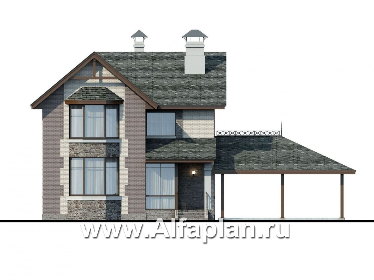 Двухэтажный дом с остекленным эркером и навесом для машин привлекает внимание изысканной сдержанностью и удобной рациональной планировкой. Проектом предусмотрены два полноценных по высоте этажа. К жилой части пристроен навес для 2  машин. Если ширина вашего участка не позволяет разместить все сооружение целиком, от навеса можно отказаться и остановится на проекте 452А — вариант без стоянки для автомобиля.