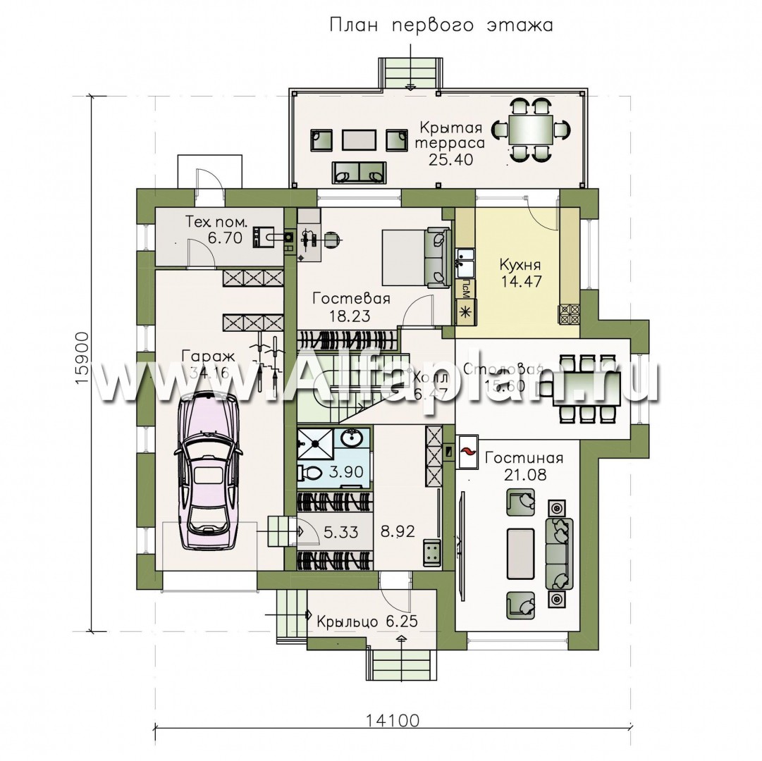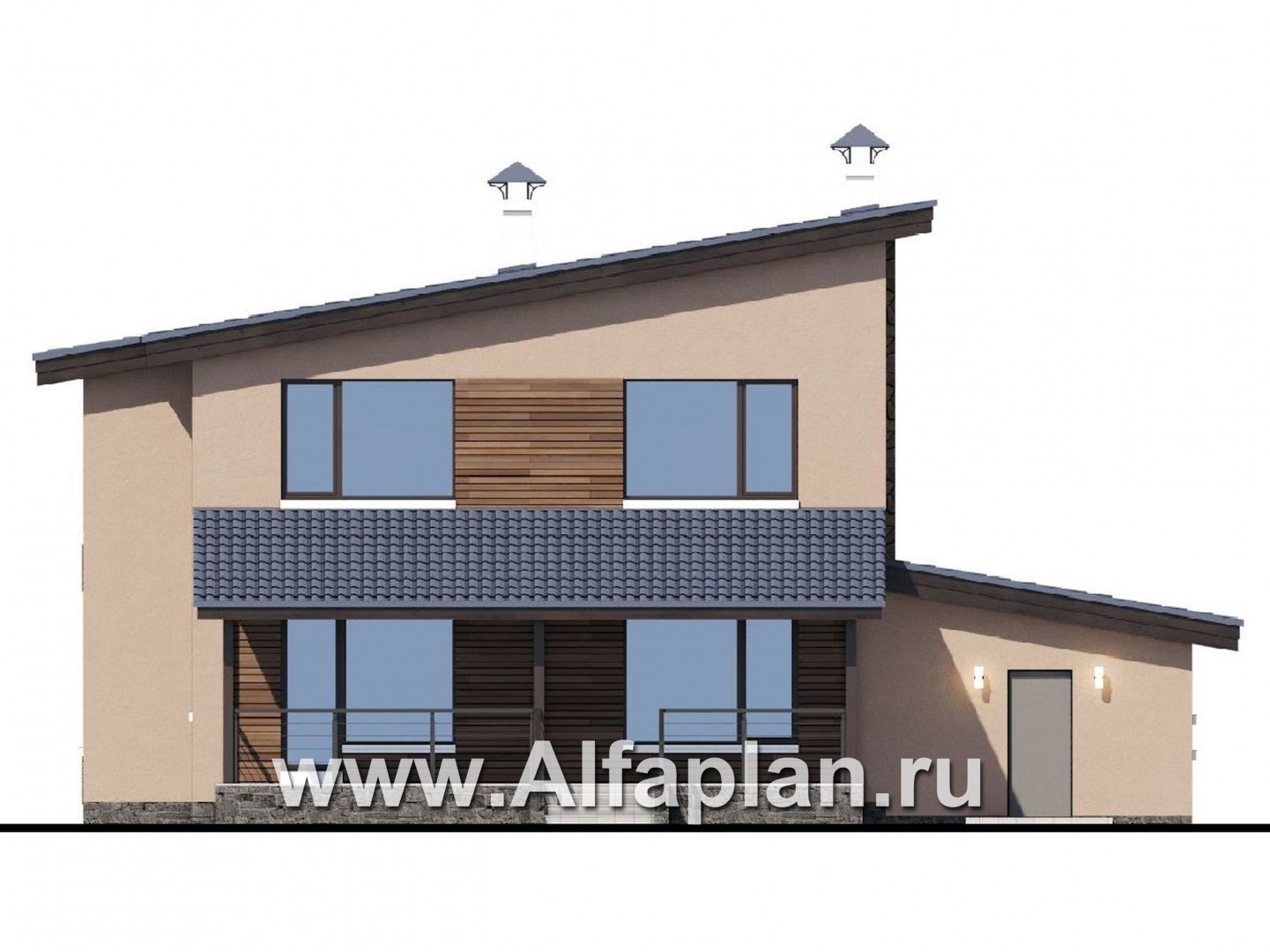 475B-S «Борей» - проект двухэтажного дома с террасой и гаражом на 1 авто, планировка с кабинетом на 1 эт, в современном стиле